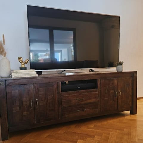 TV-bänk i ljus trä med rottingluckor – superfint skick!