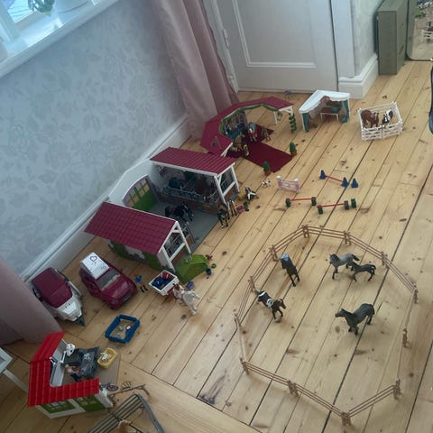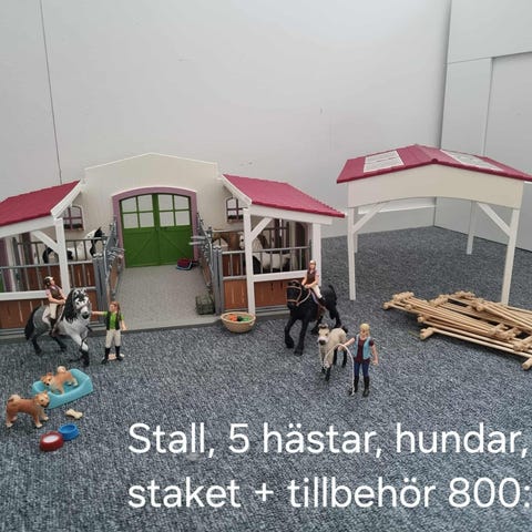 Schleich ridstall/hästgård med 14 hästar 3 människor och 14 gårdsdjur som katter, hundar, får, kor mfl. Setet inkluderar även inhägnader, hinder, duschspilta och många olika tillbehör (veterinär, sadlar, träns, hästtäcken mm.)