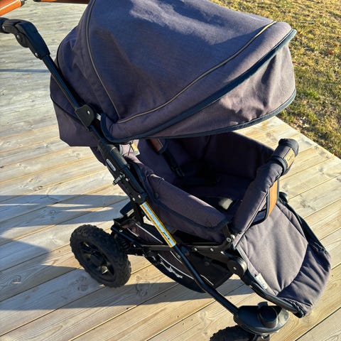 Emmaljunga barnvagn med justerbart handtag och vändbar sittdel. Barnvagnen har en mörkblå klädsel och bruna detaljer på handtaget. Den är utrustad med fyra stora terränghjul för god framkomlighet och en förvaringskorg under sitsen. Det ingår även en liggdel och regnskydd i priset.