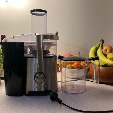 Philips juicepress med rostfri design. Utrustad med stor matningsrör för frukt och grönsaker. Lämplig för att göra färsk juice hemma.
