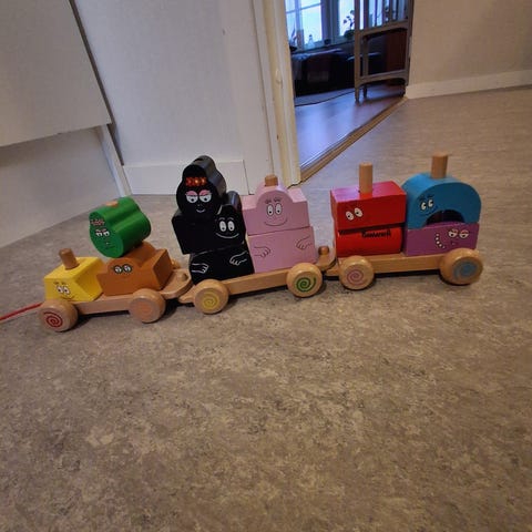 Ett charmigt tåg i trä målat med äggoljetempera.