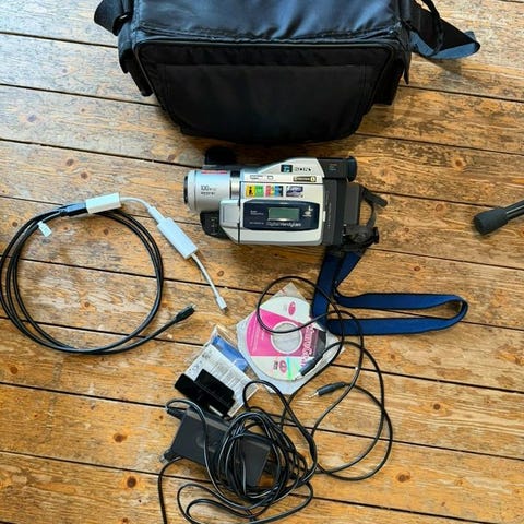 Följer med Videokamera Laddare/Strömadapter, Batterie, S-video Audio & Video kabel, Scart kabel och väska.