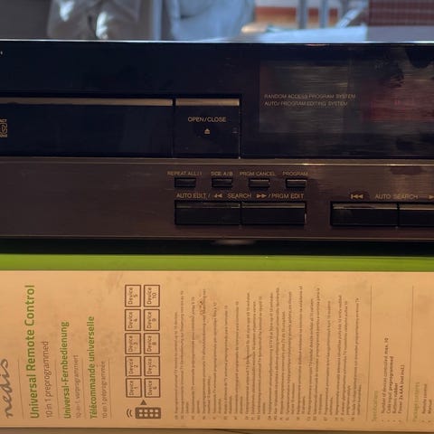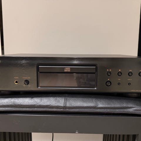 Denon DCD-680 CD-spelare i svart färg. Utrustad med line out och digital coaxial out för ljudanslutning. Kompatibel med CD-skivor och har medföljande fjärrkontroll.