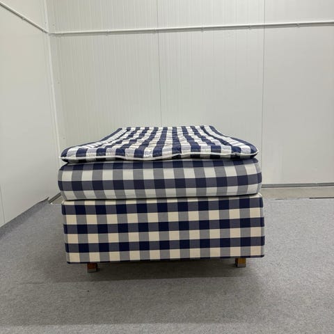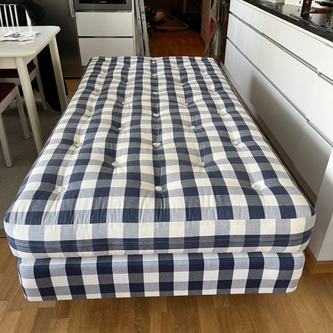Hästens säng med madrass i blåvitt rutmönster. Sängen har en träram och är utformad för en person. Madrassen är klädd i ett rutigt tyg och är anpassad för standard enkelsängsstorlek.