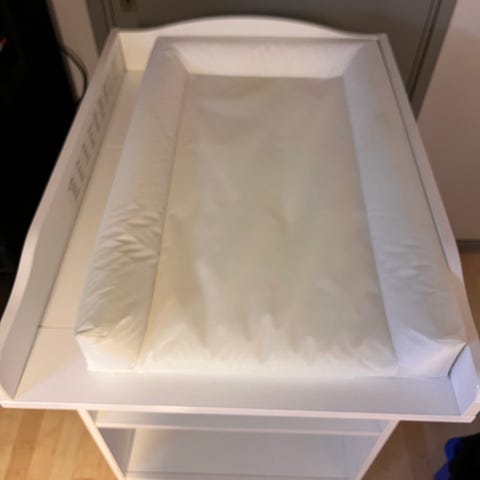 Vitt skötbord från Ikea i gott skick, dock missfärgning längst ned på bakre ben pga vatten då den stått nära duschen.
