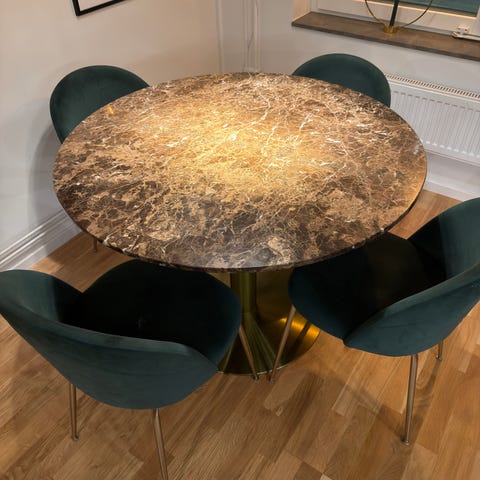 Mio Tiffany matbord och Kiwi stolar. Matbordet har en rund svart bordsskiva i trä och en central pelarfot i metall i mässing. Stolarna har grön sammetstyg och metallben i mässing.