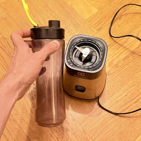 Blender med två flaskor med lock där du gör smoothie/dryck direkt i flaskan. Smidig att ta med.