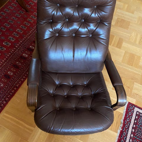 Soffan är i gott skick och har normalt bruksslitage. Ryggkuddarna innehåller dun och kan vid behov puffas upp eller fyllas på för extra stadga beroende på smak!