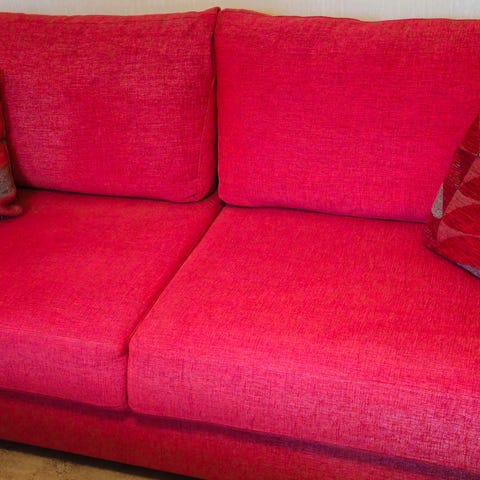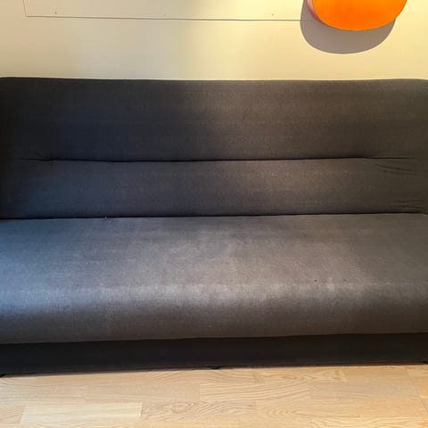 6 år gammal mörkgrå 3-sitsig bäddsoffa från IKEA som är synligt använd.