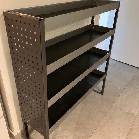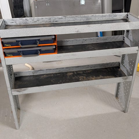 Hyllsystem för montering i bil. Systemet består av flera enheter inklusive skåp med lådor, öppna hyllor och verktygstavlor med hålmönster för upphängning. Material i metall med orange och grå färg. Avsett för organisering och förvaring av verktyg och material i arbetsfordon.