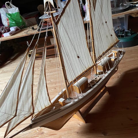 En dekorativ fatygsmodell , en s k tiotaggare. En livräddnings- och fiskebåt under 1800-talwt. Alla tillbehör t ex åror, fiskenät, tunnor mm. Längd 85 cm. Pris enligt annons eller högstbjudande.