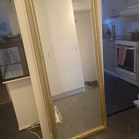 Spegel med en dekorativ ram i metallfärg. Spegeln har en detaljerad och ornamenterad design på ramen, vilket ger en klassisk och elegant stil. Passar för användning i olika rum för att förstora och ljusa upp ytor.