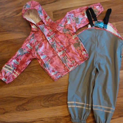 Regnställ i galon från Didriksons, rosa jacka och blå byxor.