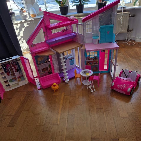 Barbie dockhus med flera rum och möbler, inklusive bord och stolar. Setet innehåller flera Barbie dockor med olika kläder, några små djur, en Barbie garderob med tillbehör samt en rosa Barbie bil. Vissa kläder behöver sys vid klänningsbanden.