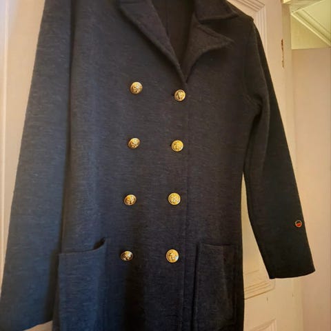 Busnel Koftor ullkofta i blå färg, damstorlek L. Koftan är tillverkad i ull och har guldfärgade knappar framtill. Den har lång ärm och två framfickor. Passar för vardagligt bruk och kan användas som ett varmt ytterplagg eller lager under ytterkläder. Koftan är original.