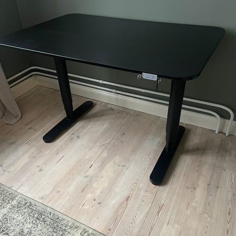 Mekaniken fungerar utmärkt, är som lägst 70 cm och går att höja till 110 cm. Bordsskivan är sliten och har hål från monteringen av diverse dator tillbehör skärmar mm. Vi har vaxduk på som medföljer. Skivan är utbytbar. Tungt men väldigt stadigt. Medtag bärhjälp.