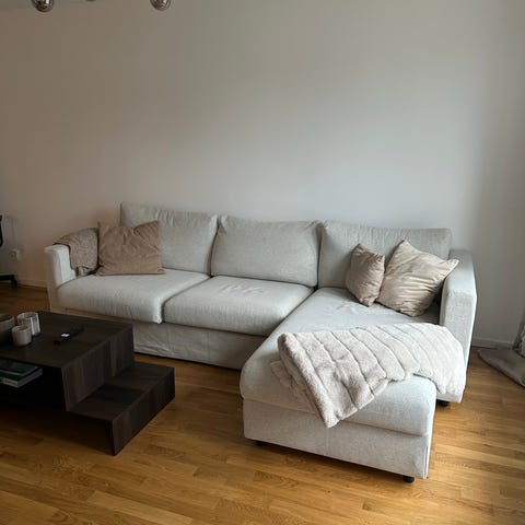 Säljer vår fina bäddsoffa från IKEA i modellen vimle gunnared beige pga flytt. Soffan är i toppenskick, ungefär 2 år gammal. Nypris 15 195 kr. Soffkuddarna går att ta av och tvätta. Den är otroligt smidig att bädda ut och även skön att sova i. Schäslongen har rymlig förvaring under sitsen. Du kan placera schäslongdelen till vänster eller höger om soffan och ändra när du vill. Se bild för mått.