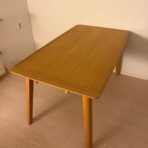 Wilma matbord 150cm + iläggsskiva 50cm. Bordsskiva i rökvaxad ekfaner, ben i vitmålad björk.
