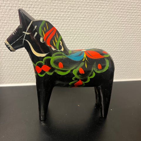 Dalahäst i trä med röd grundfärg och handmålade detaljer i vitt, blått och grönt. Dekorativ träfigur som kan användas som prydnad eller samlarobjekt.