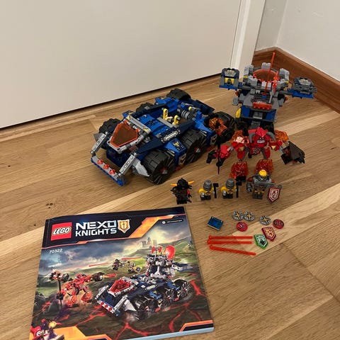 LEGO Nexo Knights byggsats som inkluderar ett blått fordon med stora hjul och en röd/orange robotliknande figur. Setet är tillverkat av plast och är en del av LEGO:s Nexo Knights tema.