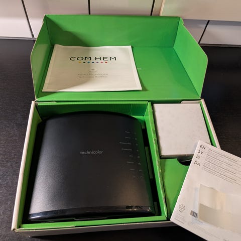 Sagemcom Fast 5366AC Boxer router med stöd för trådlöst nätverk. Routern är avsedd för hem- eller kontorsanvändning och levereras med strömkabel och manual.