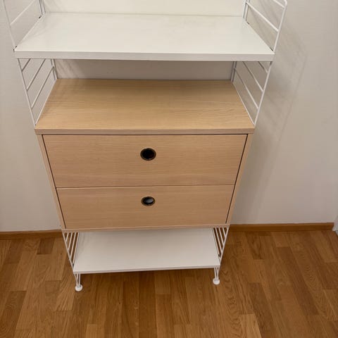 Säljer string-system med vit string skåp med skjutdörr och tre hyllplan (78x30 cm) samt tillhörande två svarta string golvgavel 200x30 cm.