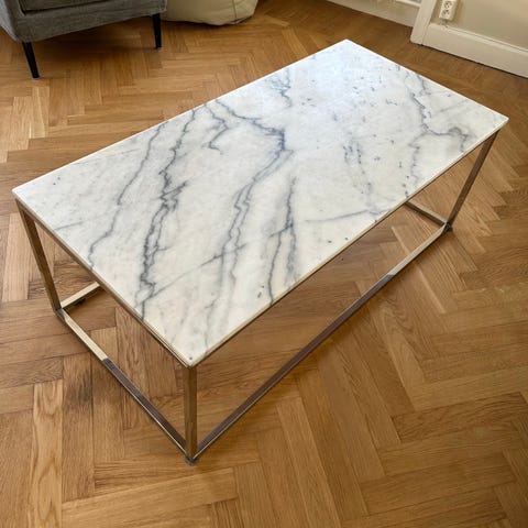 Soffbord med marmorskiva i svart med vita ådringar och metallram i svart.