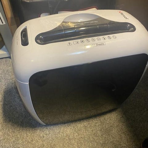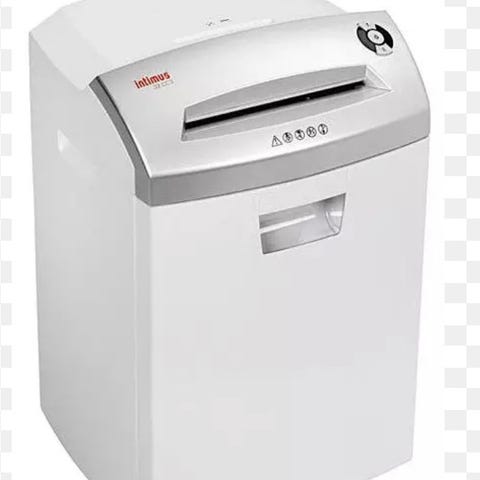 Intimus papperskvarn dokumentförstörare i vit färg. Används för att förstöra papper och dokument på ett säkert sätt. Utrustad med en behållare för uppsamling av pappersrester.
