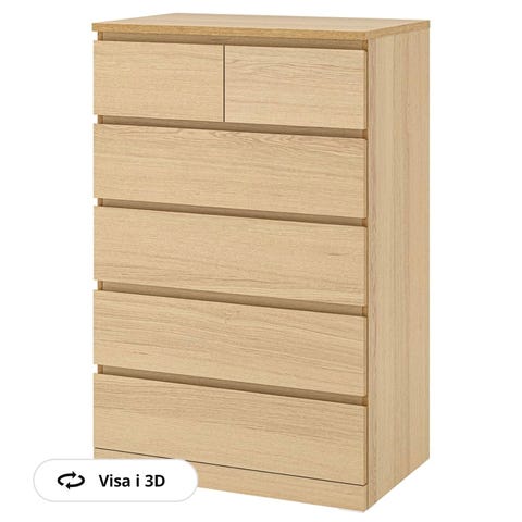 Byrå som använts för klädförvaring. Byrån är i fint skick, men finns några märken och repor i skivan. Lådor, lådfronter samt sidoskivor utan anmärkning.