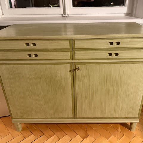 Hemnes byrå/skänk från Ikea. Omgjord med mörkgrå kalkfärg som tyvärr blivit fläckig och avskavd.
