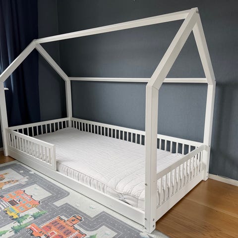 Junior bed with a house-shaped wooden frame, purchased from Babylove.se.