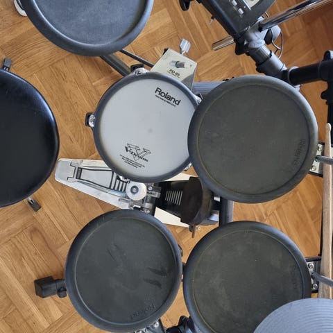 Roland V-Drums elektroniskt trumset med flera trumplattor och cymbaler monterade på stativ. Trumsetet är svart och inkluderar en pedal från Pearl. Ansluts via kablar till en kontrollenhet för ljudinställningar. Passar för övning och musikproduktion i hemmiljö.
