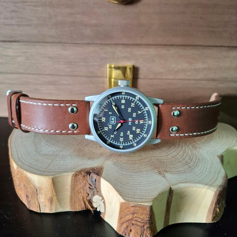 Klockan har ett guldpläterat boett (AU10), en svart urtavla med romerska siffror och datumvisning, mekanismen med 17 juveler.
