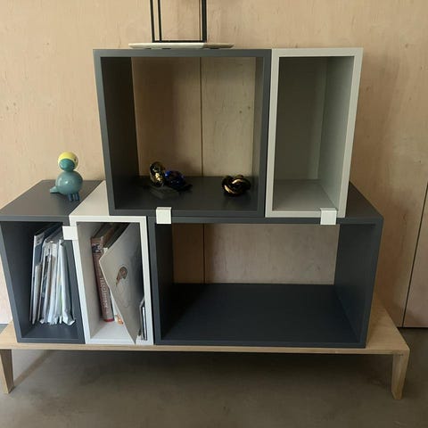 Svart bokhylla som är formbar. 11 st ”fästen” där man kan luta böckerna emot.