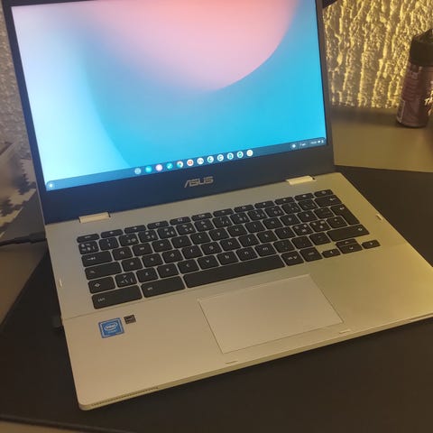 Asus Chromebook bärbar dator i blå/grå färg. Utrustad med tangentbord och pekplatta. Innehåller HDMI-port och Intel-processor. Passar för användning som en Chromebook med Chrome OS.