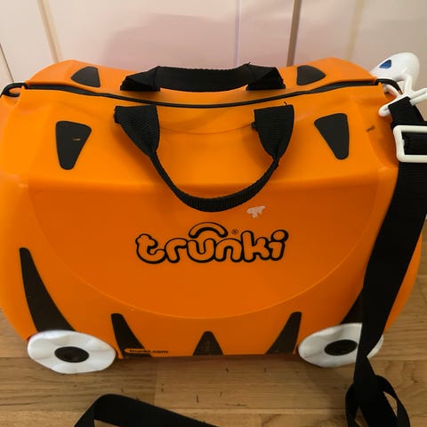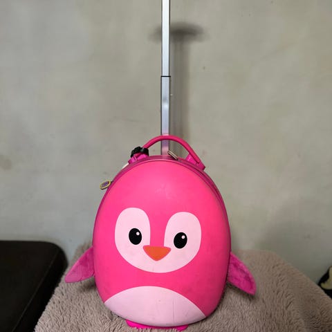 Resväska för barn. Handtag & hjul. Blå med vita prickar. Begagnad enl. bilden.