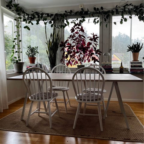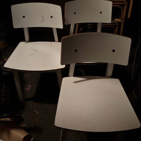 Säljer fyra stolar i fint skick med spår av mindre slitage. Tror att dem är från IKEA. Enkla, snygga och bekväma med metallben.