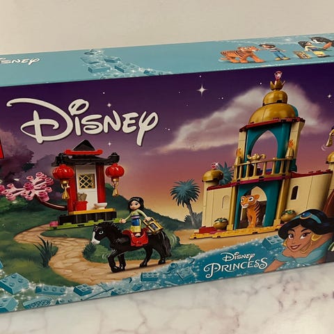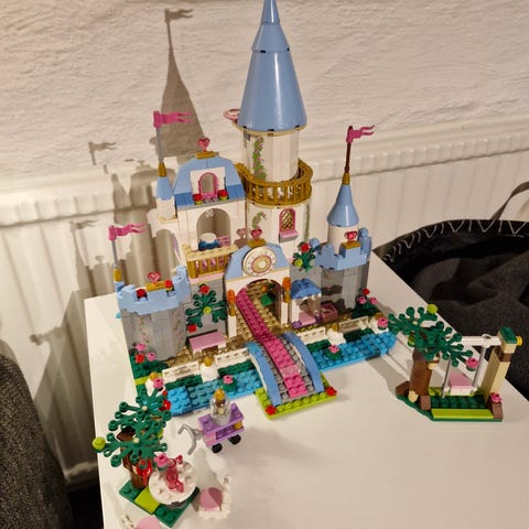 LEGO Disney lekset med figurer av Ariel och en delfin. Setet inkluderar en säng och en vagn i rosa och blå färger, samt tillbehör som en spegel och en blomma. Passar för barn som gillar Disney-tema och LEGO.