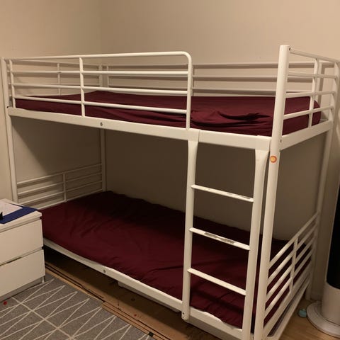 IKEA våningssäng med ram i vitt och grå sängskydd. Sängen har stege för åtkomst till övre sängen och ribbotten för madrassstöd. Passar för barn eller gäster i mindre utrymmen.
