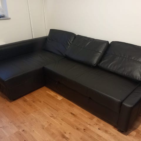 Schäslongsoffa Damhale svart från JYSK Lätt använd, säljer pga flytt rök djur fri ,Måtten visas på bilden.