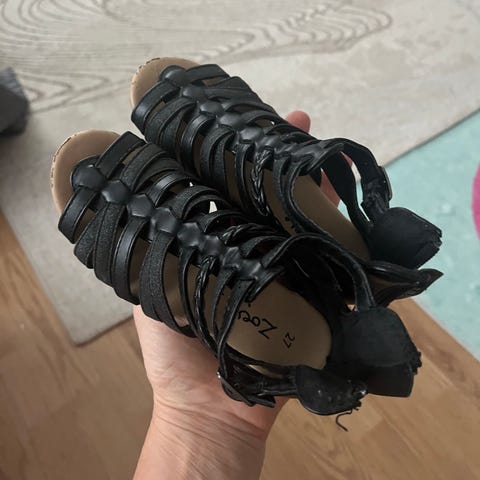 Fina sommar sandaler för flicka i storlek 27 med flera remmar och dekorativa nitar. Öppning med dragkedja bak för enkel på- och avtagning. Innermått ca 16 cm.