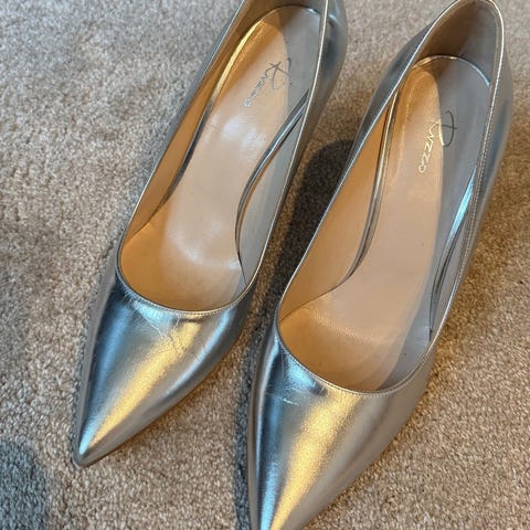 Zara klackskor i storlek 38. Skorna är designade för kvinnor och har en stilren och elegant design. De är tillverkade i material som framgår av bilderna och har en spetsig tåform med dekorativa detaljer. Passar för formella och festliga tillfällen.