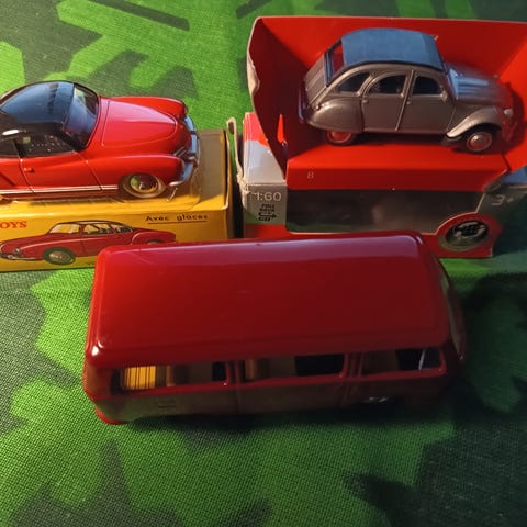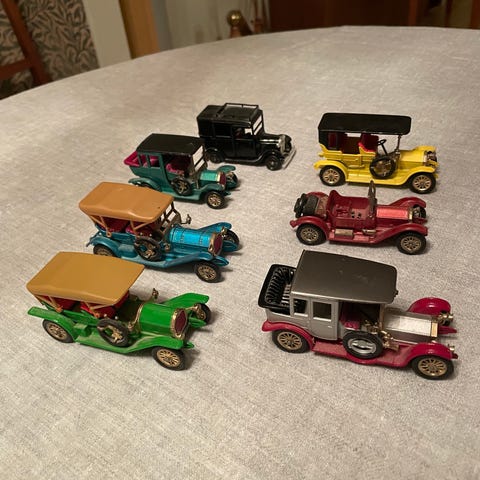 Samling av modellfordon och motorcykel i olika storlekar och färger