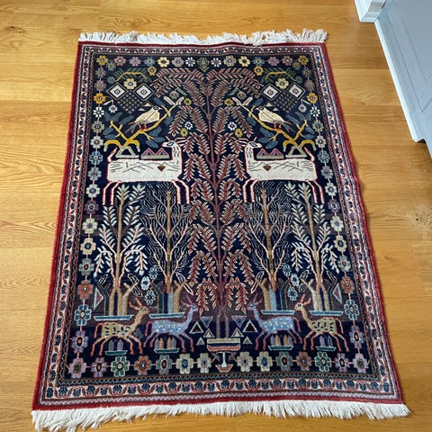 Orientalisk matta i bruna och gröna nyanser med dekorativt mönster. Mått cirka 130x200 cm. Passar för användning som golvmatta i vardagsrum eller andra utrymmen.