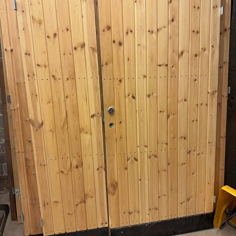 Trädörr i trä med lås och medföljande nyckel. Dörren har en enkel design och är lämplig för inomhusbruk. Färg och storlek är inte specificerade. Garderober