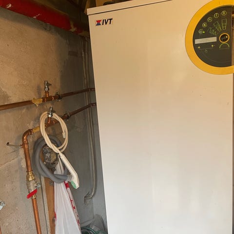 Nibe varmvattenberedare i vit färg. En apparat för uppvärmning och lagring av varmvatten. Har anslutningar för vatten och el. Används för att tillhandahålla varmvatten i bostäder eller andra byggnader.