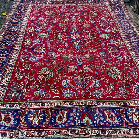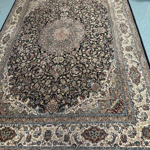 Persiska matta med orientalisk design. Mattan har ett detaljerat mönster i mörka och ljusa färger. Den är lämpad för användning i olika rum och ger en klassisk stil.