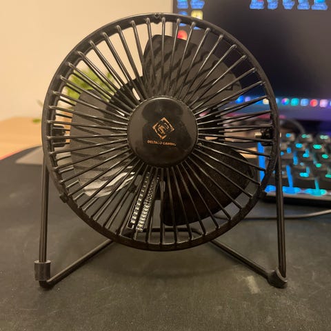 Blå bordsfläkt i liten storlek med klämfäste för enkel placering på bord eller andra ytor. Passar för personligt bruk vid behov av luftcirkulation.