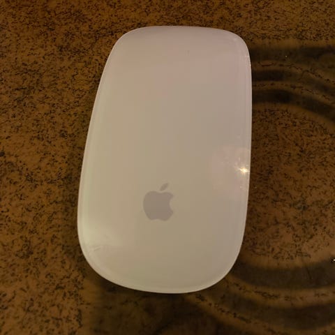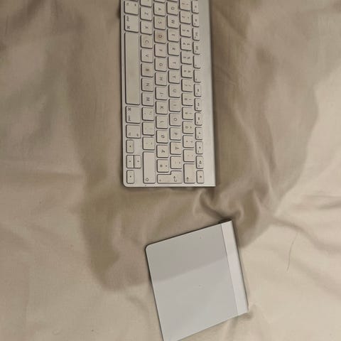 Apple tangentbord och mus i vitt, designade för att användas tillsammans med datorer. Tangentbordet har ett kompakt och stilrent utförande med numeriskt tangentbord. Musen har en slät yta och är ergonomiskt utformad för bekväm användning.