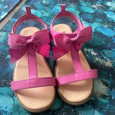 Barn sandaler för flicka i storlek 27, innermått ca17.4 cm. Sandalerna har en mönstrad sula med havstema i grönt och rosa färger. Remmarna är rosa och justerbara för att passa foten. Sulan är svart med mönster för bättre grepp. Passar för vardagligt bruk under varmare väder.